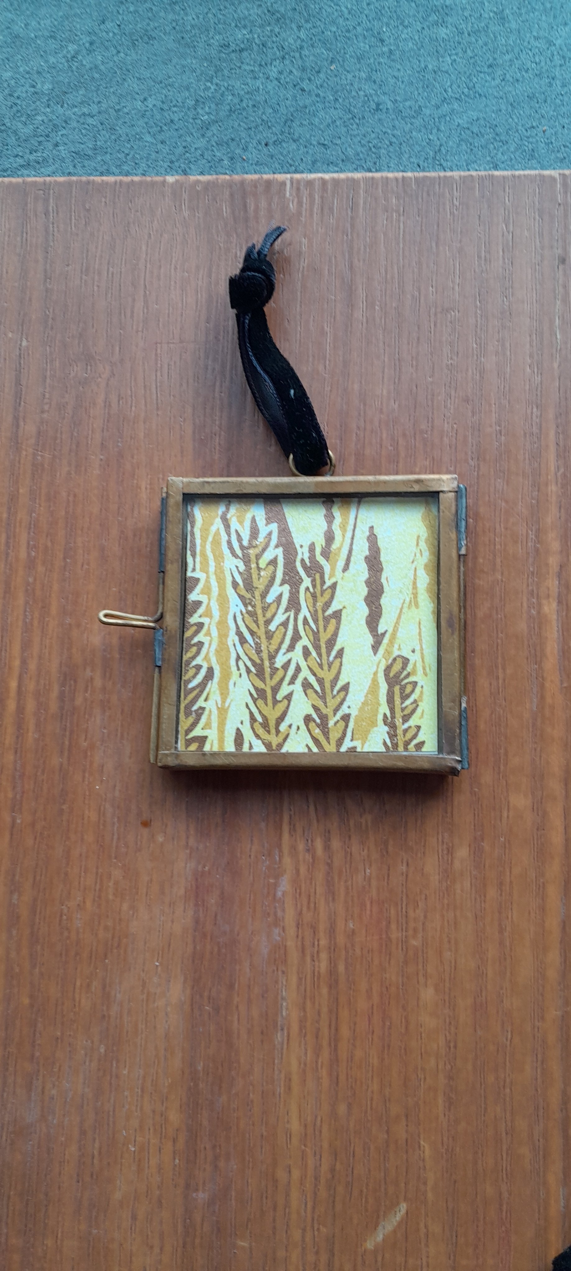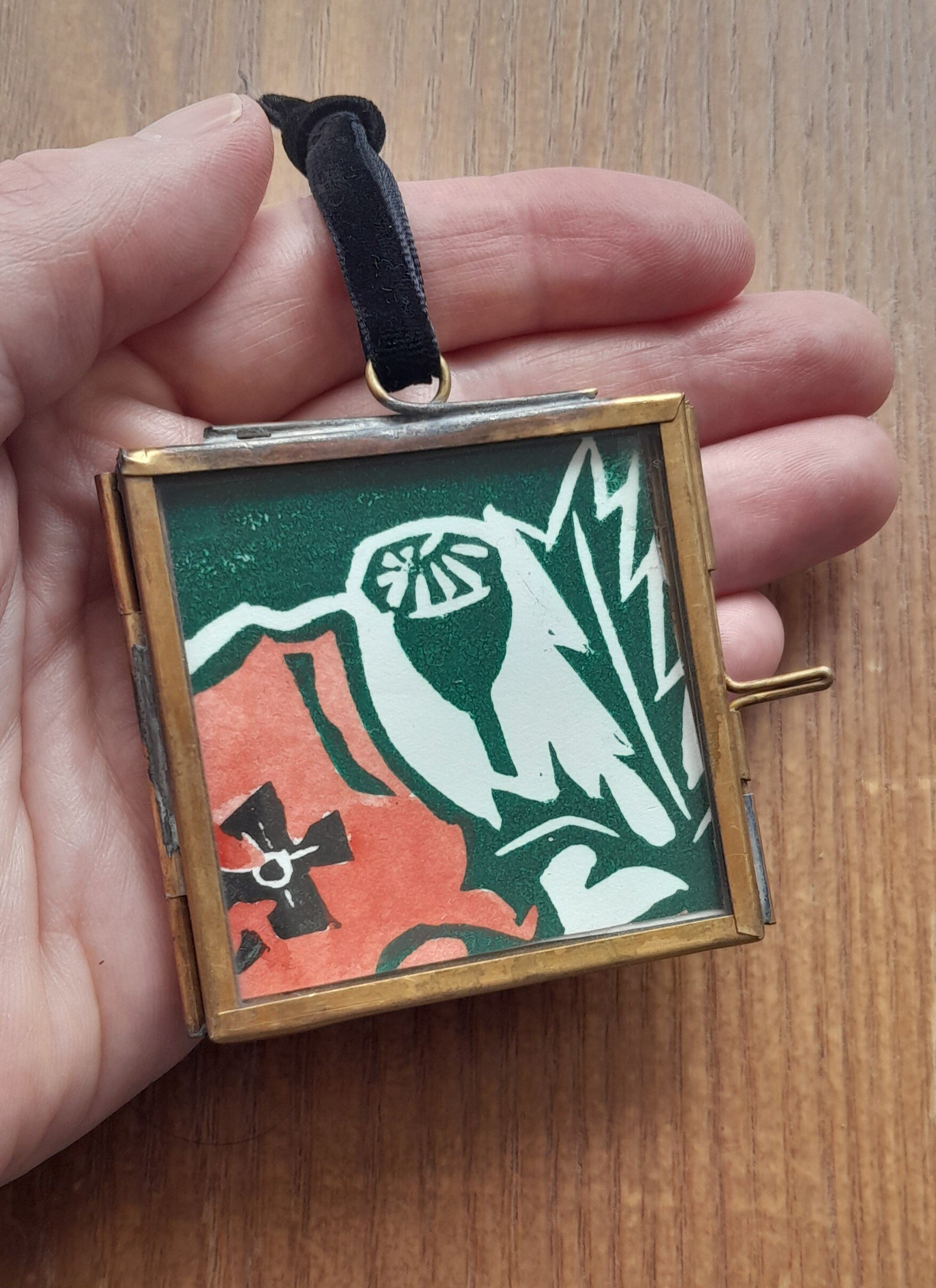 A mini-masterpiece presented in a delicate 2” x 2” brass and glass frame. Hung with a black velvet ribbon, these original print / original print collage are a perfect small gift for lovers of beautiful things.